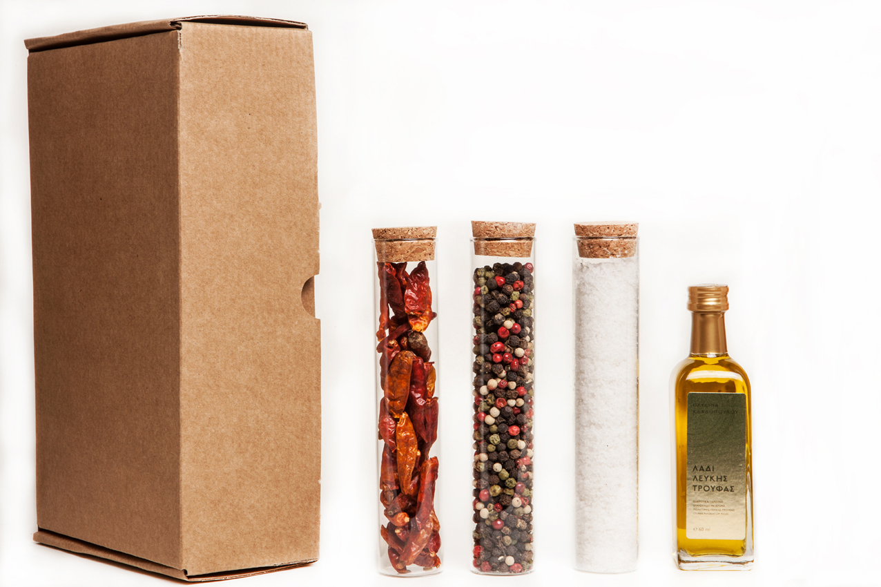 Basic gourmet spicebox με μιξ πιπεριών, ανθό αλατιού Μεσσολογγίου και καυτερες πιπερίτσες Ισπανίας σε δοκιμαστικούς σωλήνες και λάδι τρούφας ελληνικής! Ενα δώρο μπαχαρικών για διαφορετικούς συνδιασμούς.
