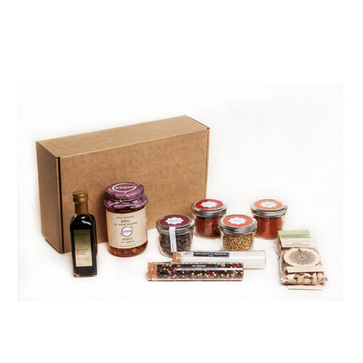 Δώρο μπαχαρικών με γλυκό του κουταλιού, το δώρο περιλαμβάνει μπαλσάμικο με τρούφα, 4 μπαχαρικά μακροπίπερο, πάπρικα καπνιστή , κόλιανδρο και μπουλ πέπερ, δοκιμαστικό σωλήνα με ανθό αλατιού και μιξ πιπεριών και γλυκο του κουταλιού μήλο με κρόκο κοζάνης της γιαμ.