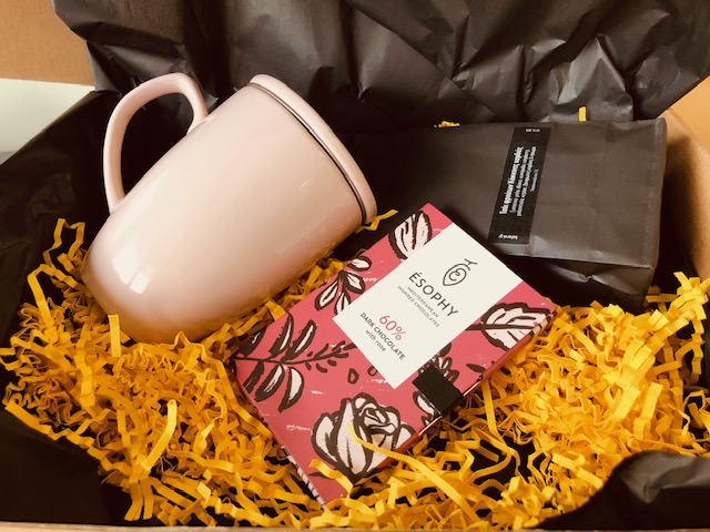 ένα όμορφο δώρο με μια κούπα ροζ, 100 γραμ. τσάι φρούτων κόκκινες καρδιές και 1 σοκολάτα τριαντάφυλλο esophy