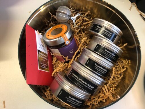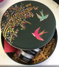 μεταλικό giftbox στρογγυλό πράσινο(L) ένα όμορφο κουτί με 5 γεύσεις τσαγιού χριστουγενννιάτικες και άλλες (τσάι μαύρο χριστουγέννων, τσάι πράσινο χιονισμένο έλατο και τσάι φρύτων ευτυχία, τσάι φρούτων blue lady & τσάι πράσινο μαγεμένο δασος ), μεταλικό φίλτρο παραμάνα, μαρμεάδα σμέουρο, φράουλα ή σύκο και σοκολάτα γάλακτος χριστουγεννιάτικη edition esophy. μπορείτε να κάνετε οποιαδήποτε αλλάγη ή προσθήκη στα σχόλια.