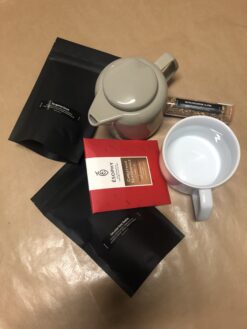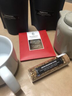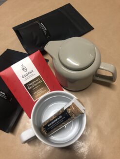 ενα giftbox με την τσαγιέρα και κούπα μαζί που μπορειτε να τοποθετείται την 1 πανω στην αλλη μαζί με 2 γεύσεις τσαγιού που επιλέγεται εσεις στα σχολια μαζί με την χριστουγεννιάτικη σοκολάτα esophy με χριστουγεννιάτικα αρωματα και ενα σωλήνα με μείγμα για ζεστό κράσι. το σετ της τσαγιέρας βγαινει σε γκρι- λευκο και πορτοκαλί με μαύρο.